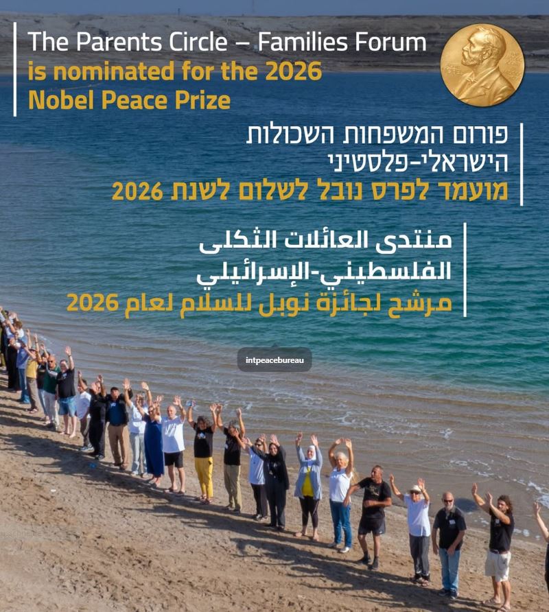 - Parents Circle-Families Forum: Nominiert für den Friedensnobelpreis 2026PCFF erklärt sich tief bewegt von dieser Würdigung seiner langjährigen Arbeit zur Förderung von Versöhnung, Dialog und Gewaltfreiheit zwischen Israelis und… Parents Circle-Families Forum: Nominiert für den Friedensnobelpreis 2026 weiterlesen